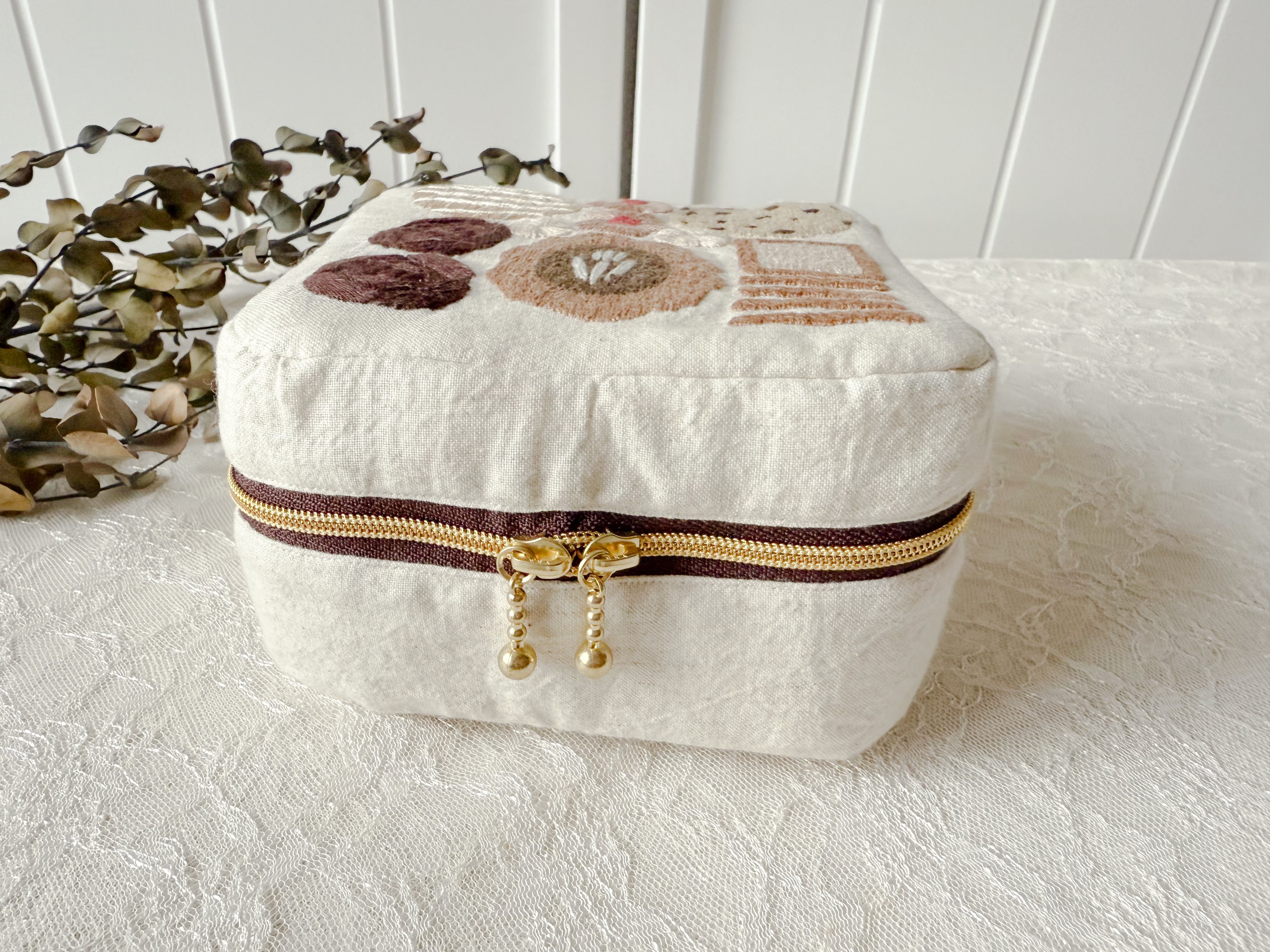 パティシエのリスさんの新作お菓子缶をポーチにしました。