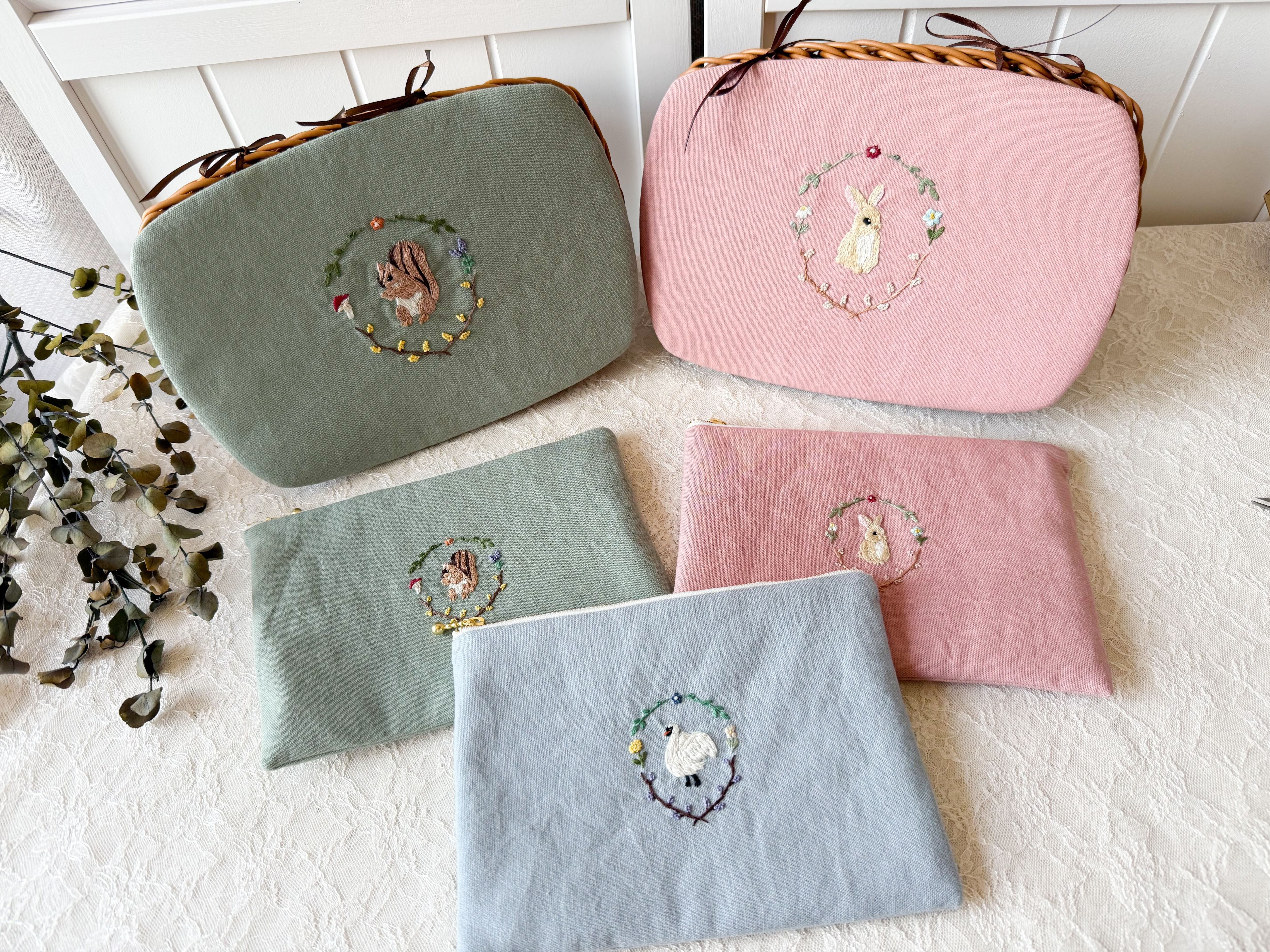 バスケットとポーチで動物やお色を揃えても可愛らしいです。