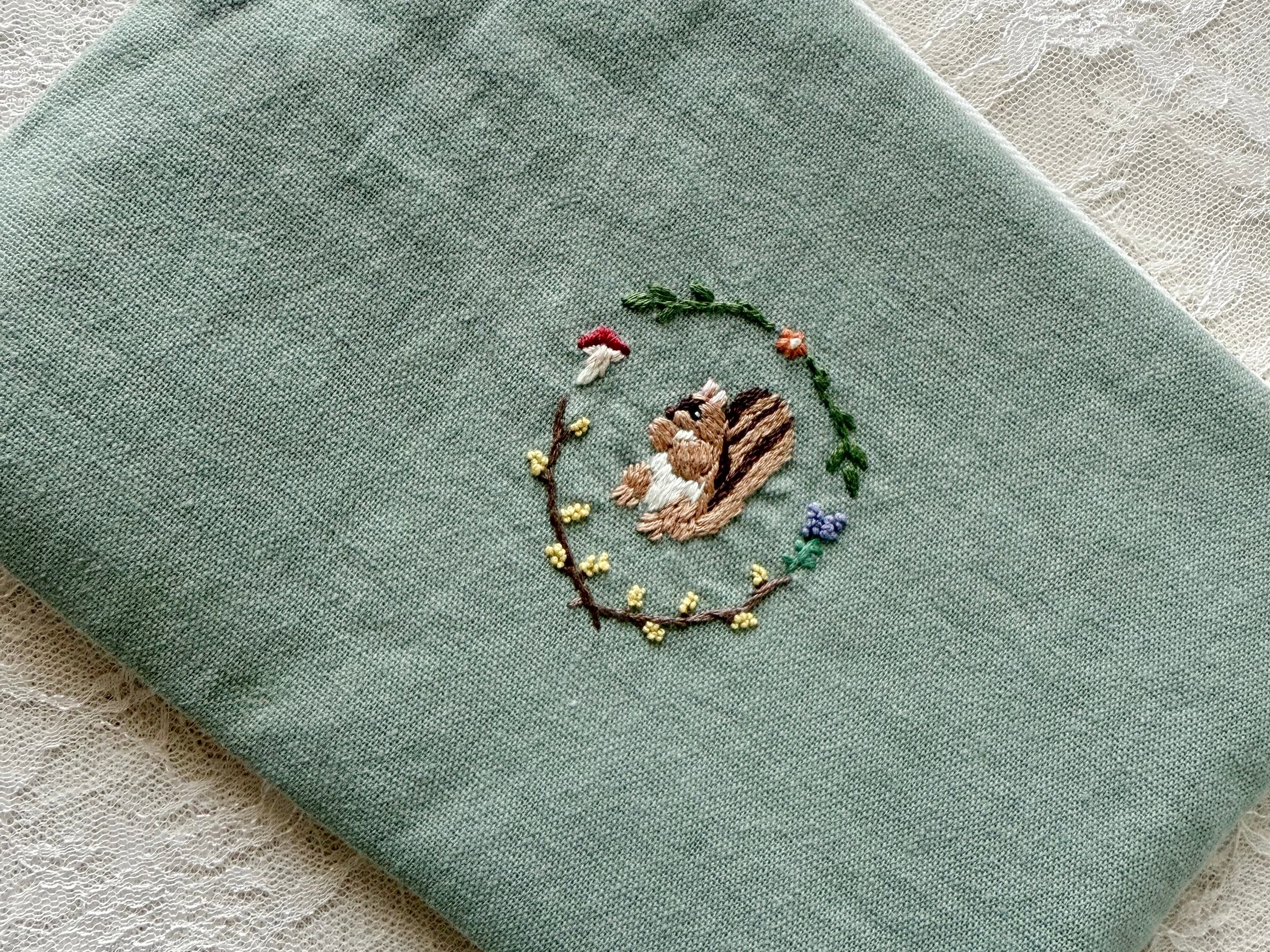 アースカラーを中心としたコットンキャンバスの生地に、ウサギ、リス、スワンの周りをお花たちが囲む様子を手刺繍しています。
