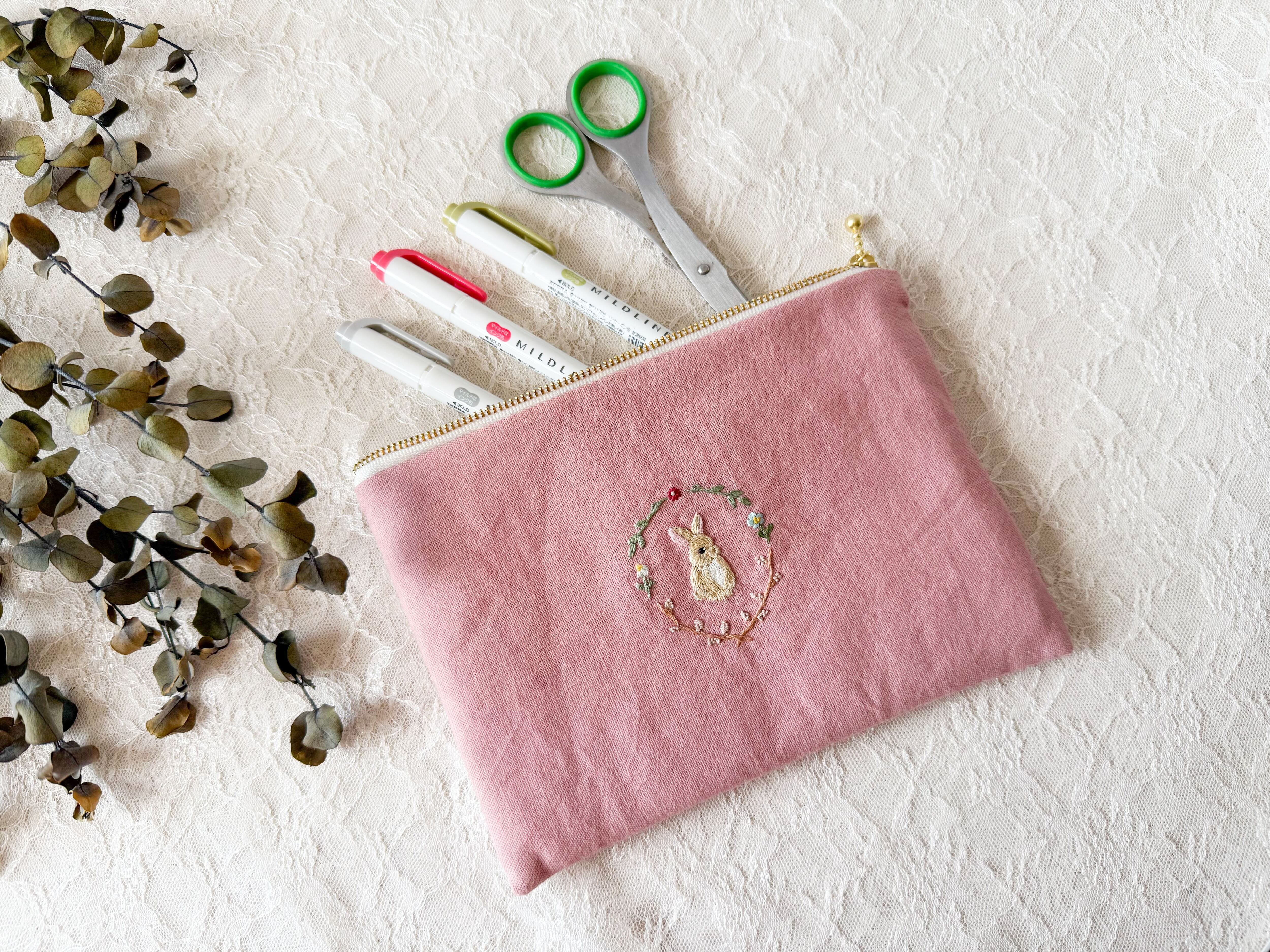 素材:布(表:綿麻/裏:綿)・刺繍糸・糸、接着芯、ファスナー