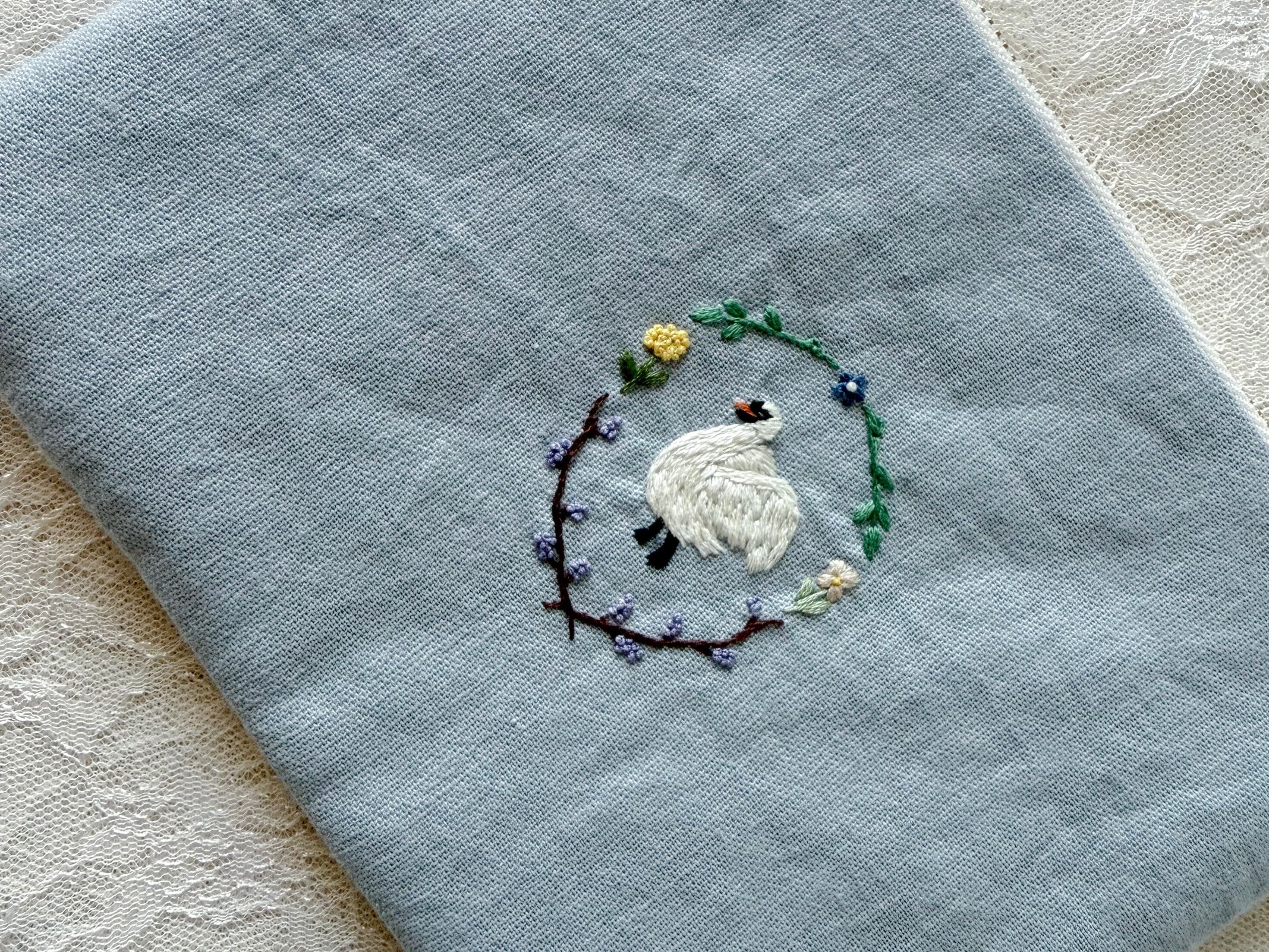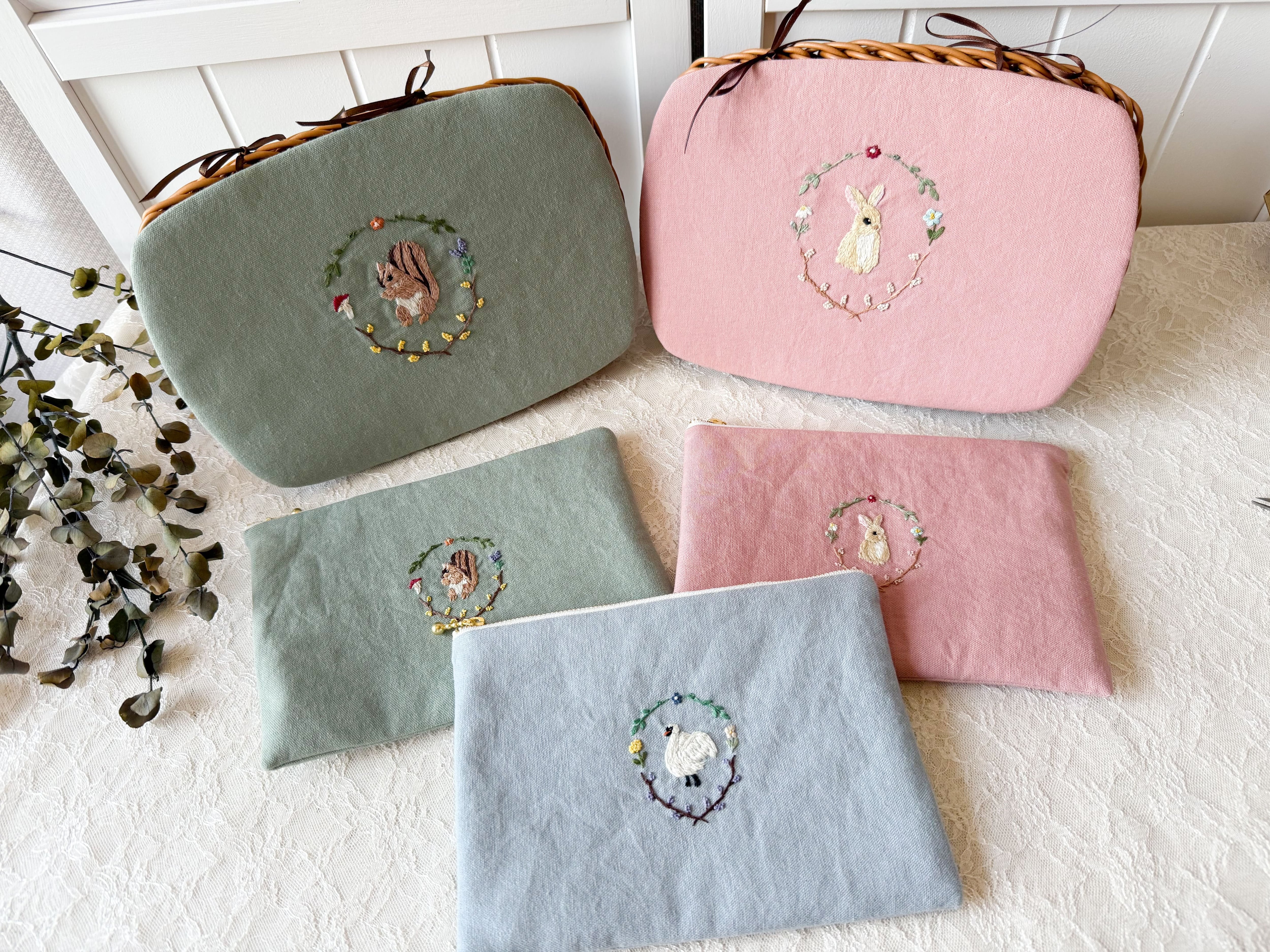 アースカラーを中心としたコットンキャンバスの生地に、ウサギ、リス、スワンの周りをお花たちが囲む様子を手刺繍しています。