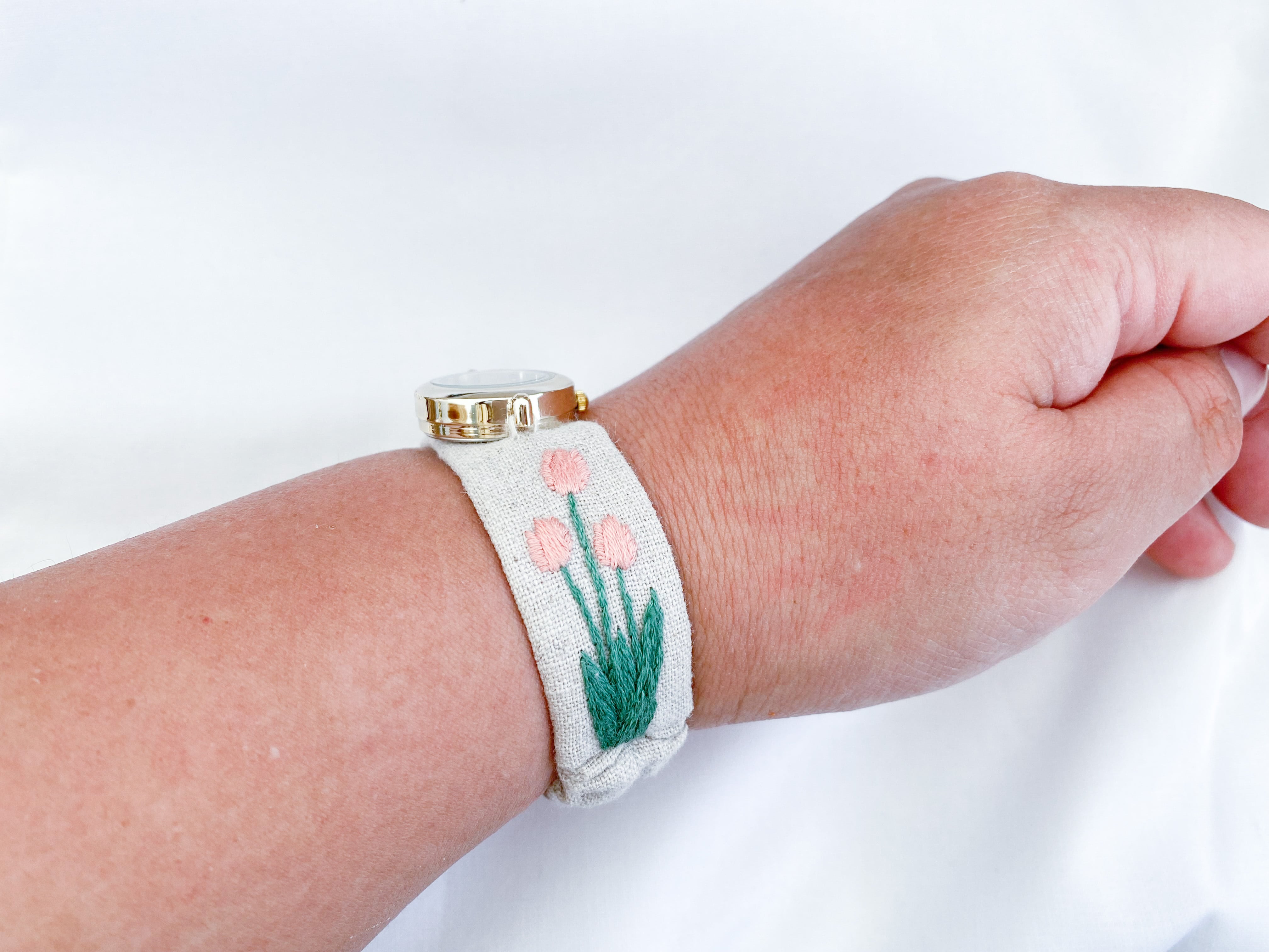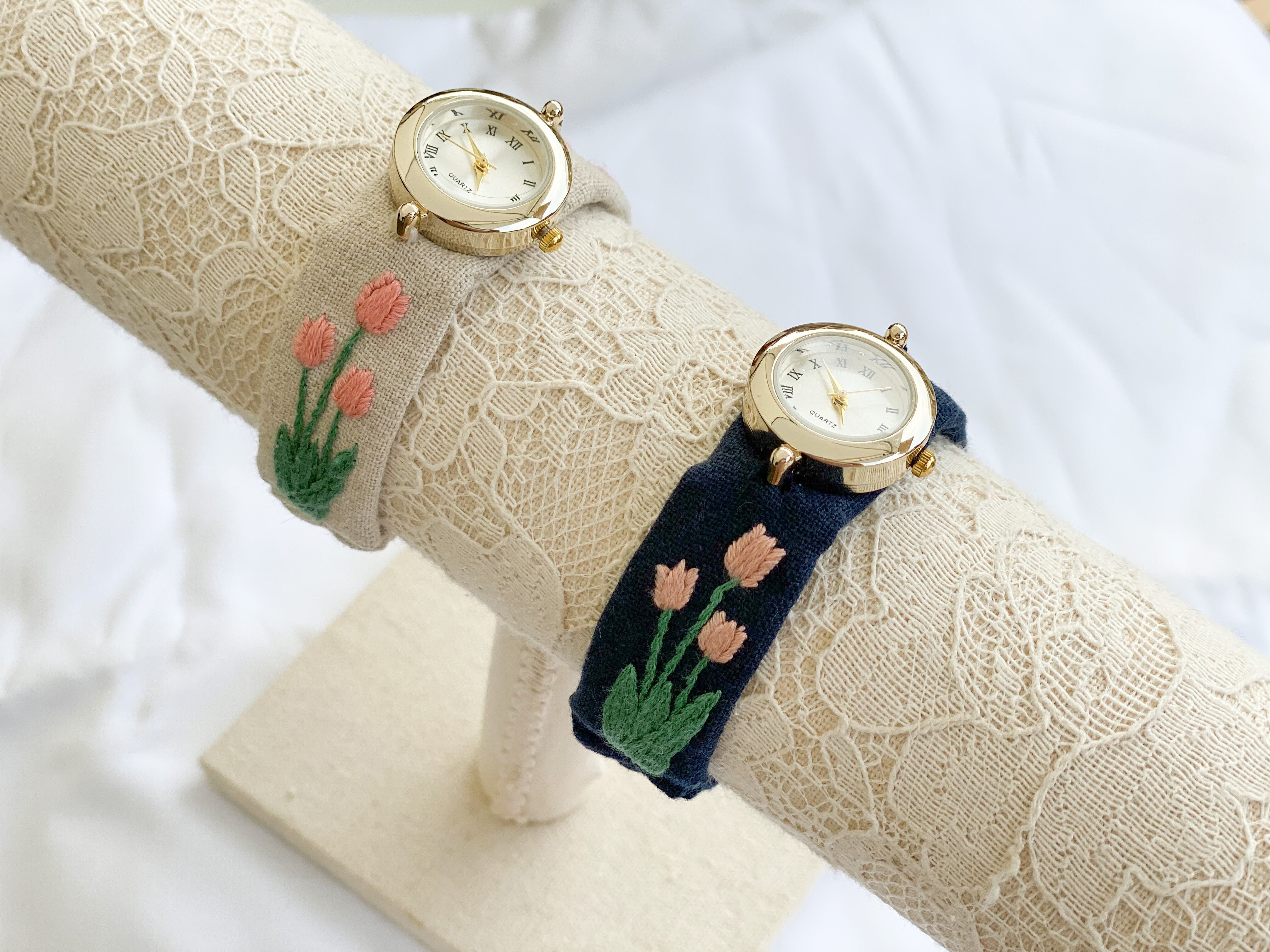 手刺繍のベルトが珍しい、ふんわり柔らかな着け心地の腕時計です。