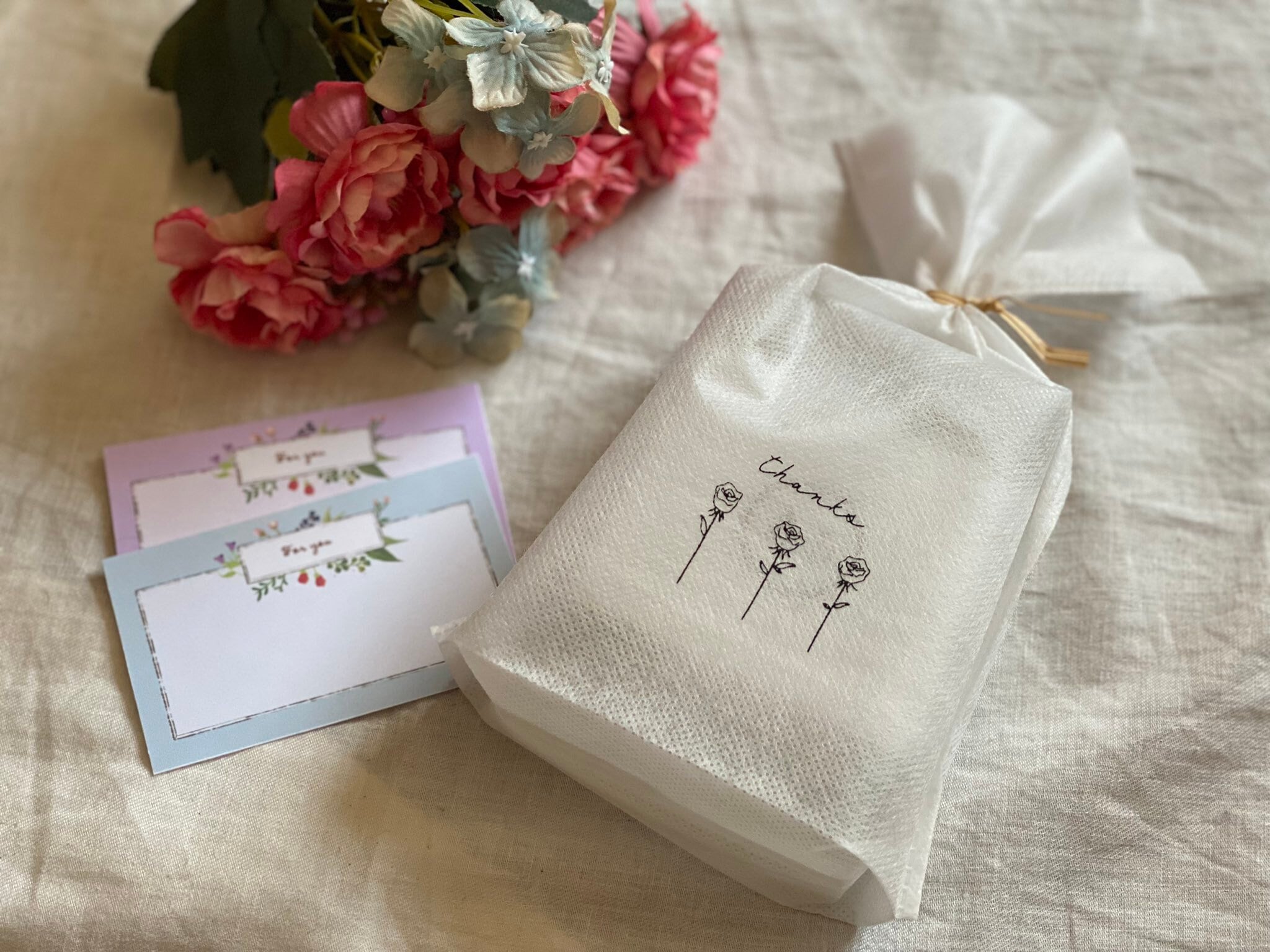 バッグやお洋服などの大きな作品→不織布の袋または包装紙で包み、リボンやタグをおつけします。