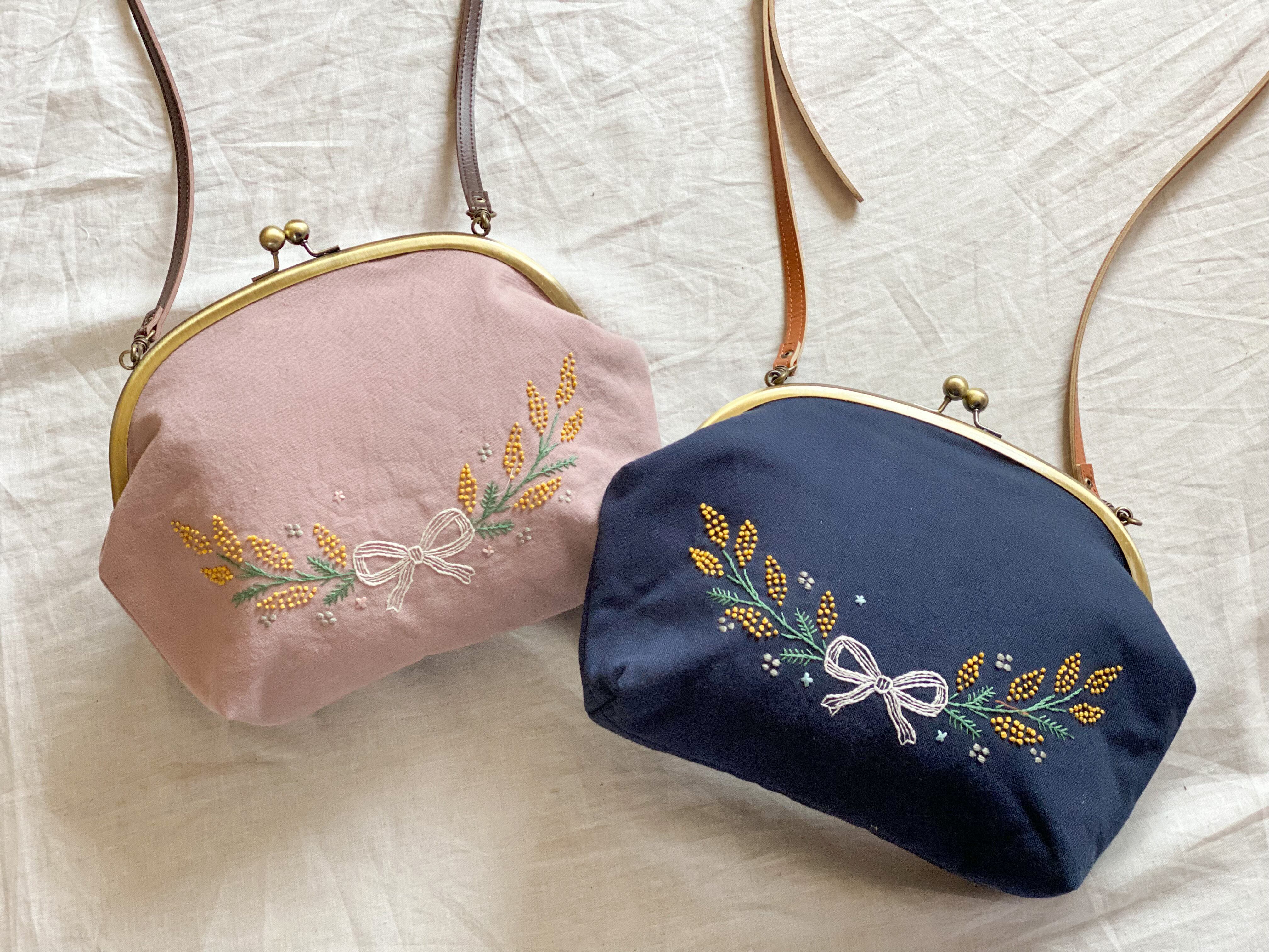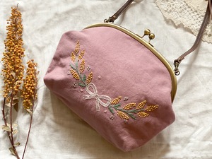 11号の帆布にひと針ひと針たっぷりのミモザとリボンを丁寧に手刺繍した、がま口のショルダーバッグです。