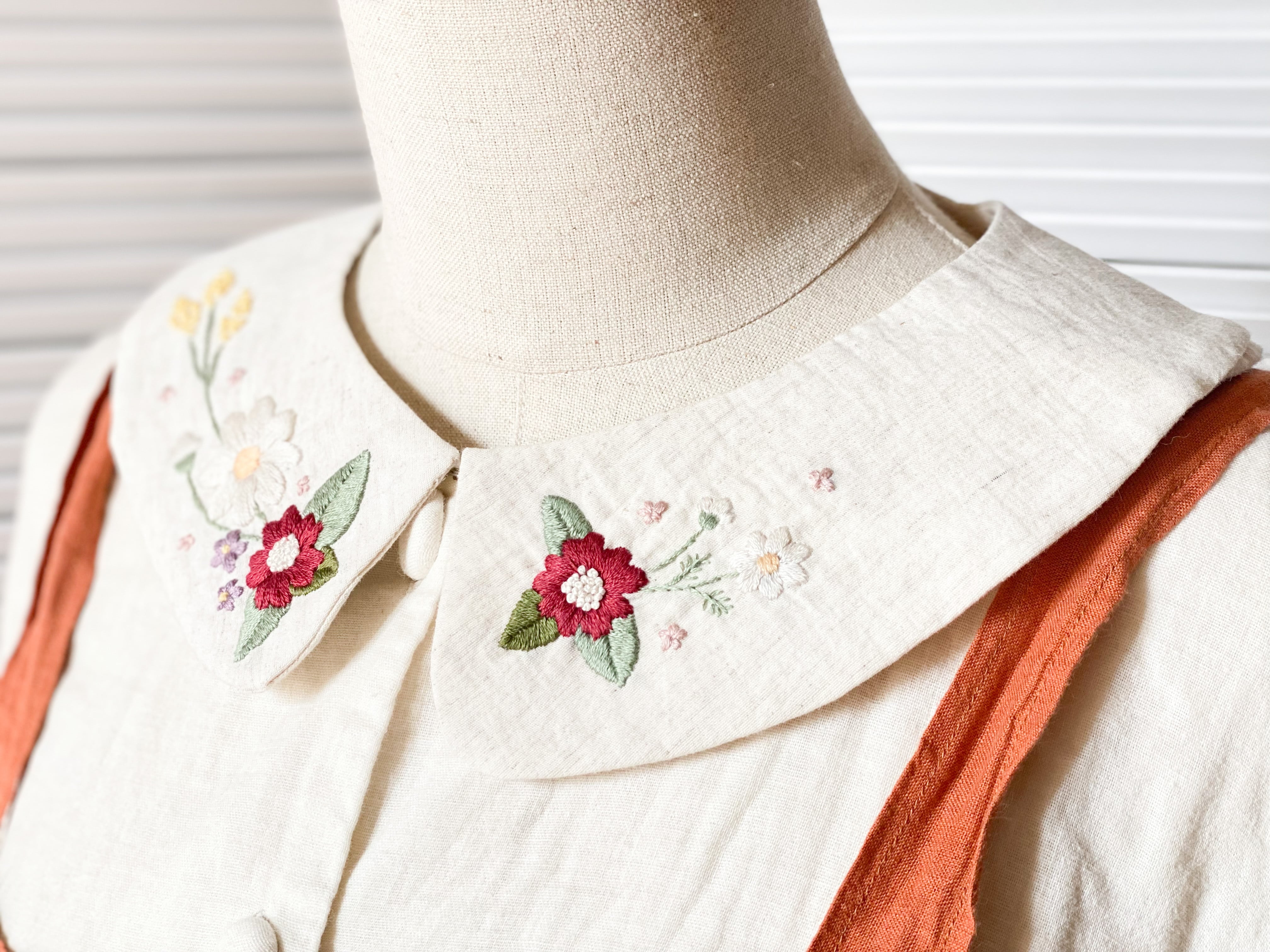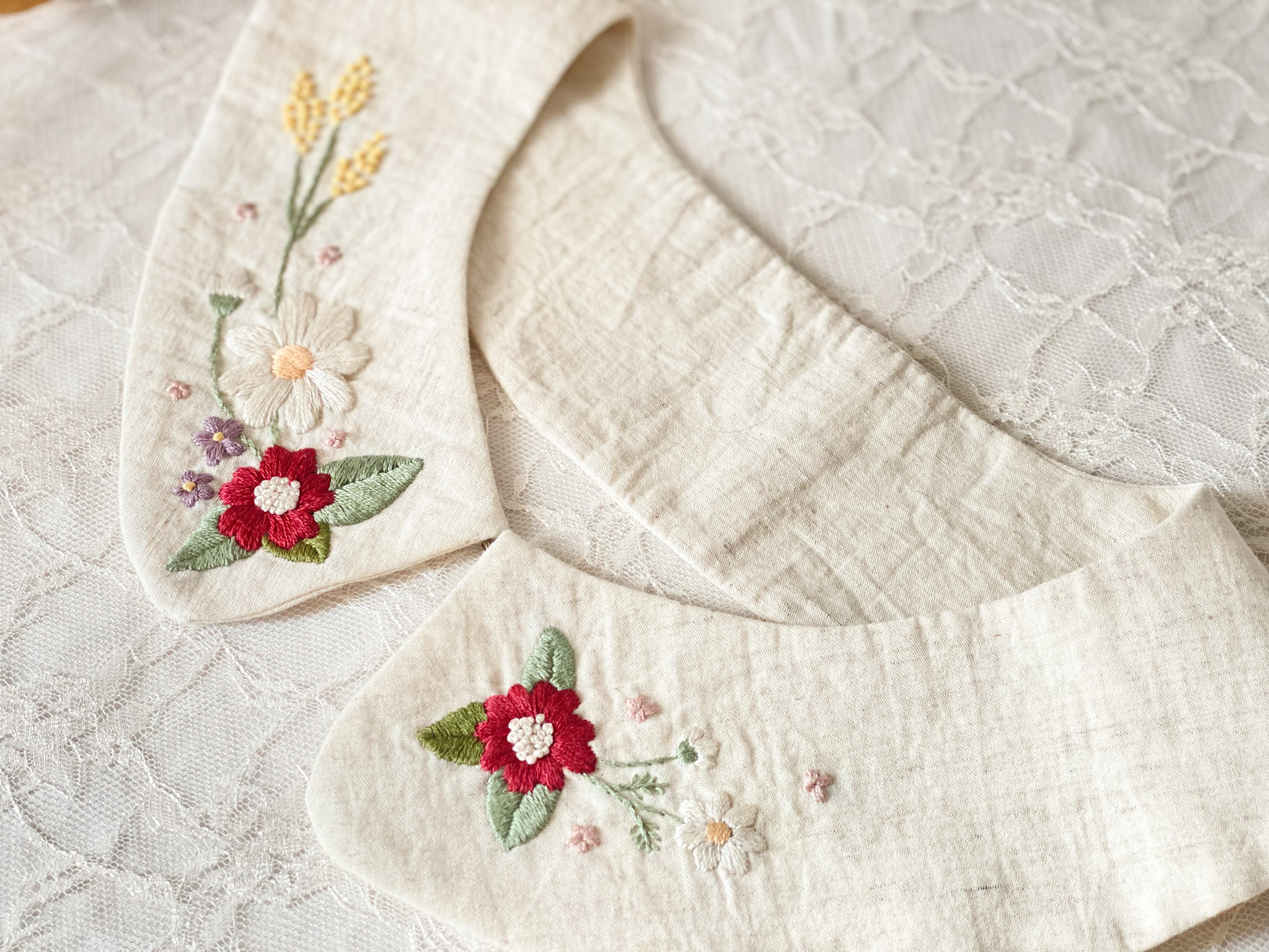 お花の手刺繍が可愛い、丸襟タイプのつけ襟です。
