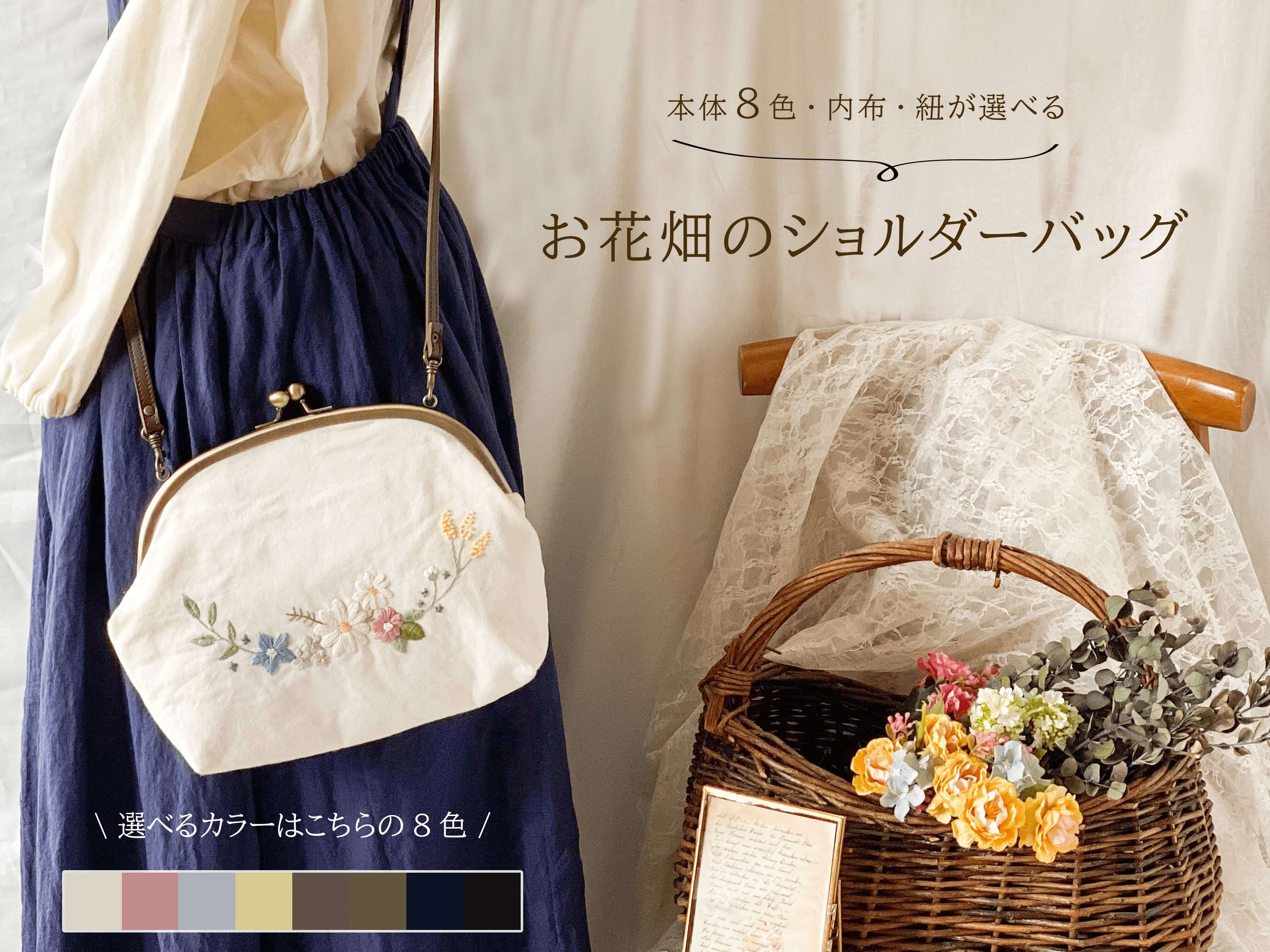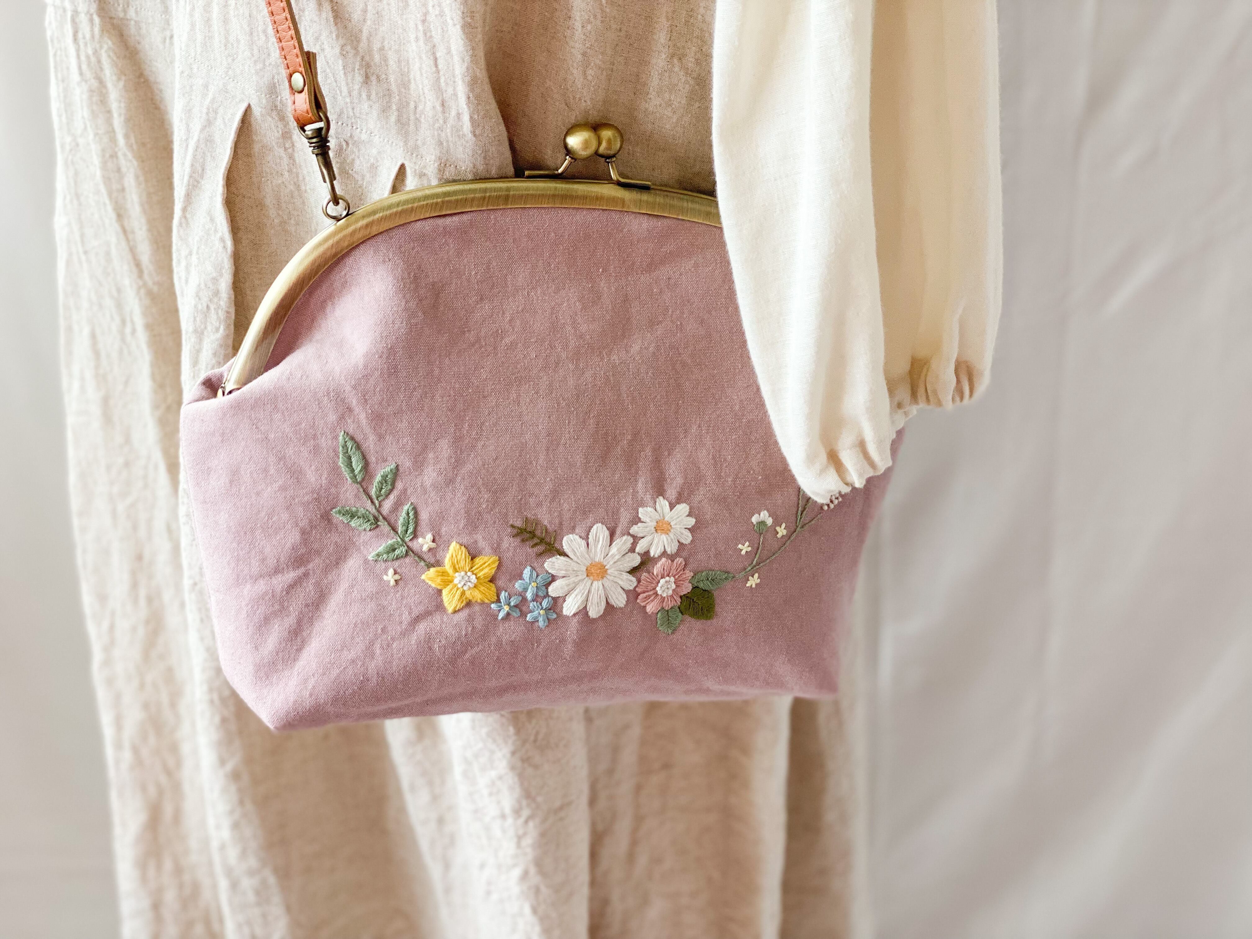 11号の帆布にひと針ひと針お花を丁寧に刺繍した、がま口のショルダーバッグです。