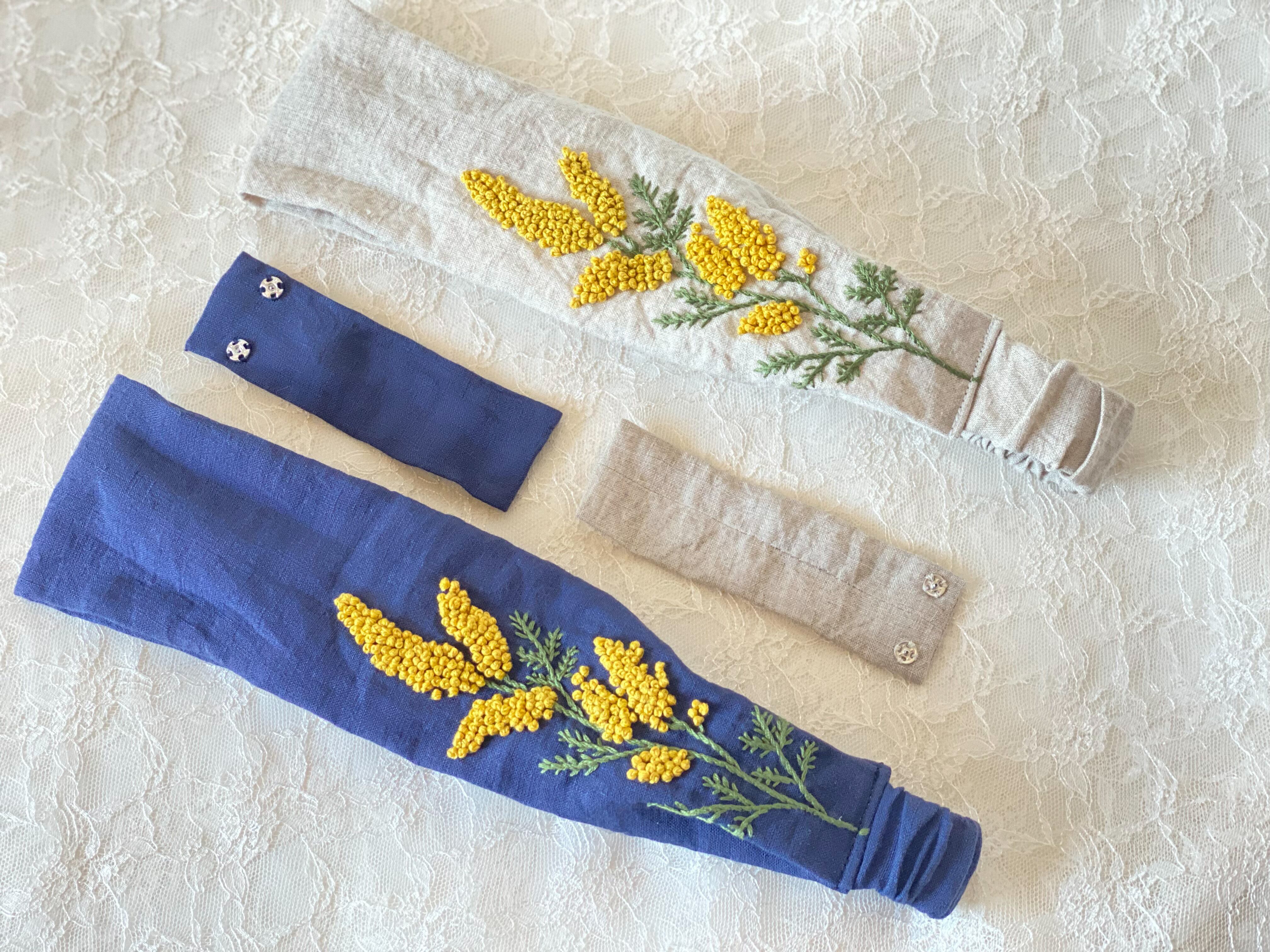 肌触りのいいベルギーリネンにたっぷりミモザのお花の刺繍を施した2wayタイプのカチューム(ヘアバンド)です。