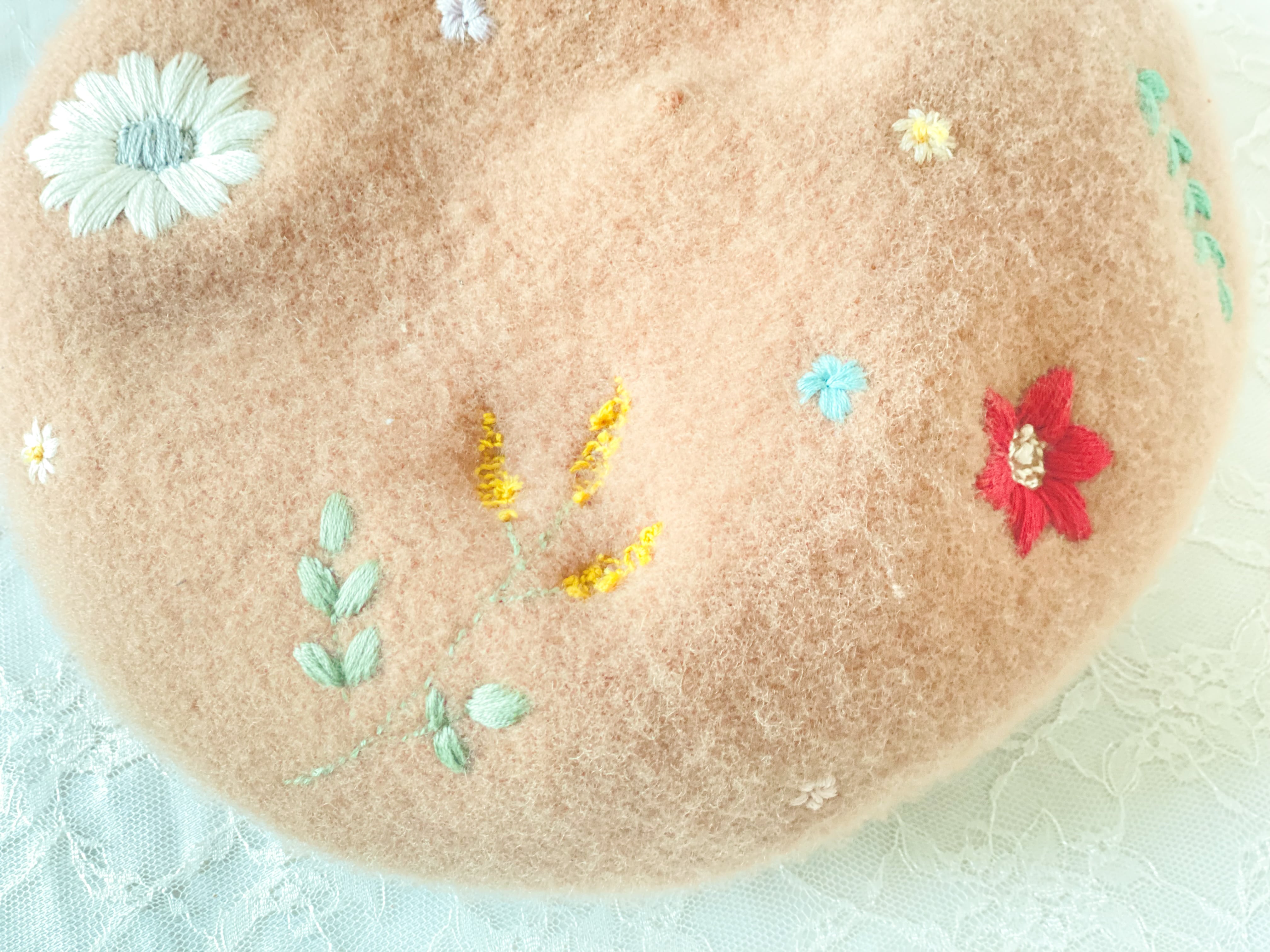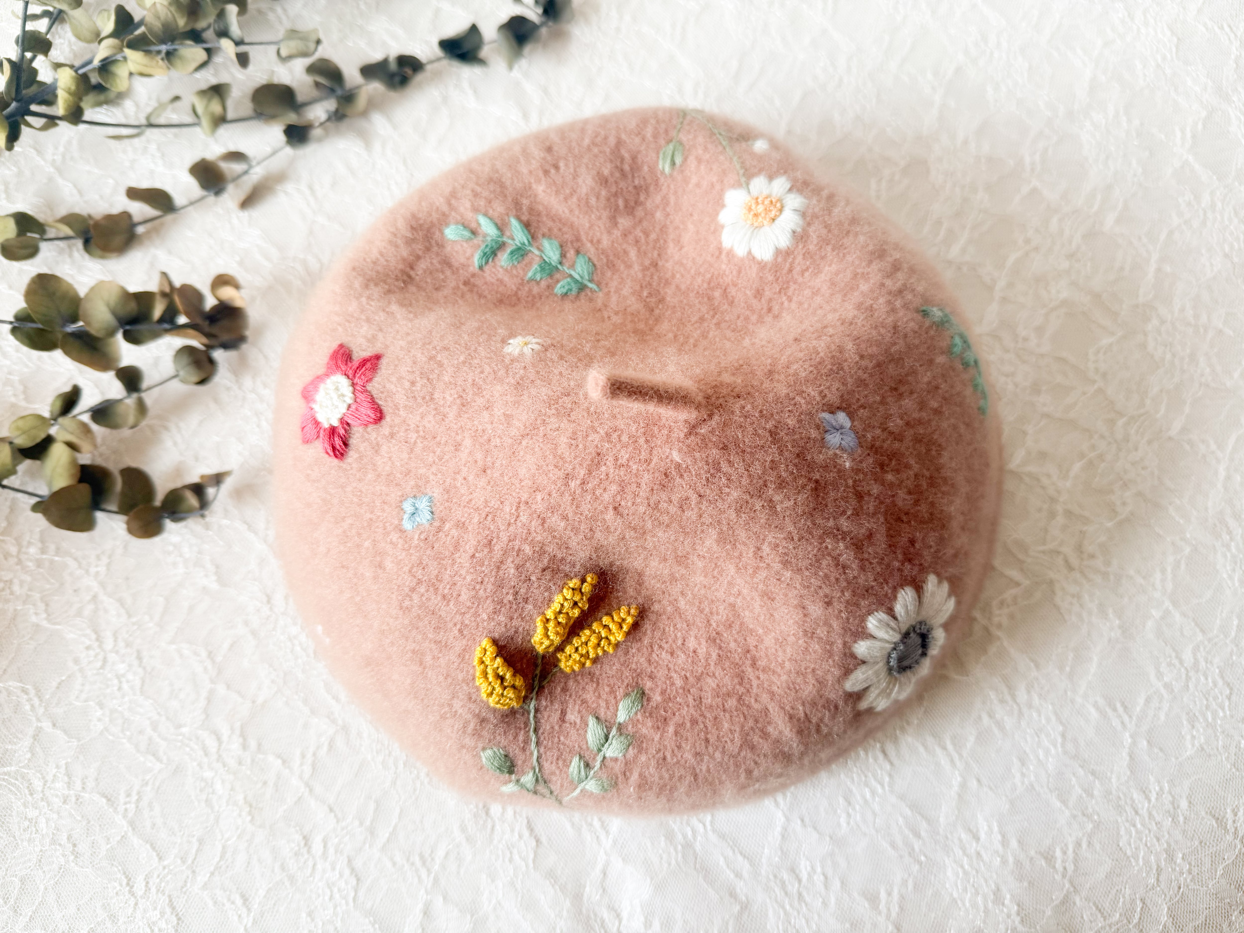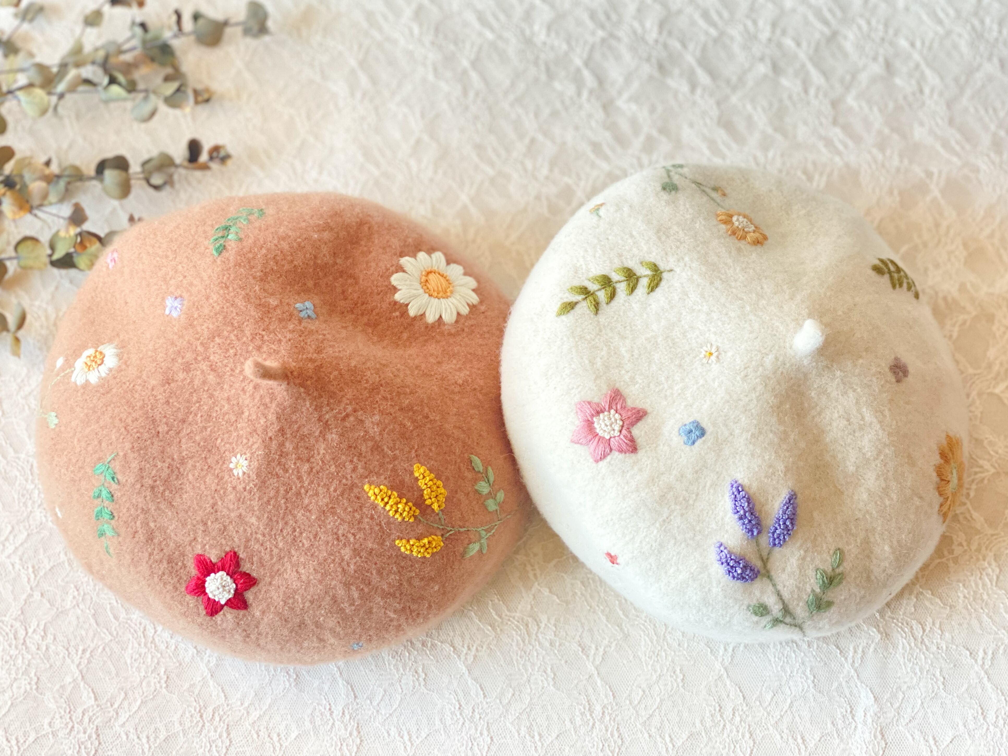 キャメルのベレーに赤や黄色、ピンクなどの大小異なる草花たちがランダムに刺繍されているため、かぶる向きで表情が変わります。