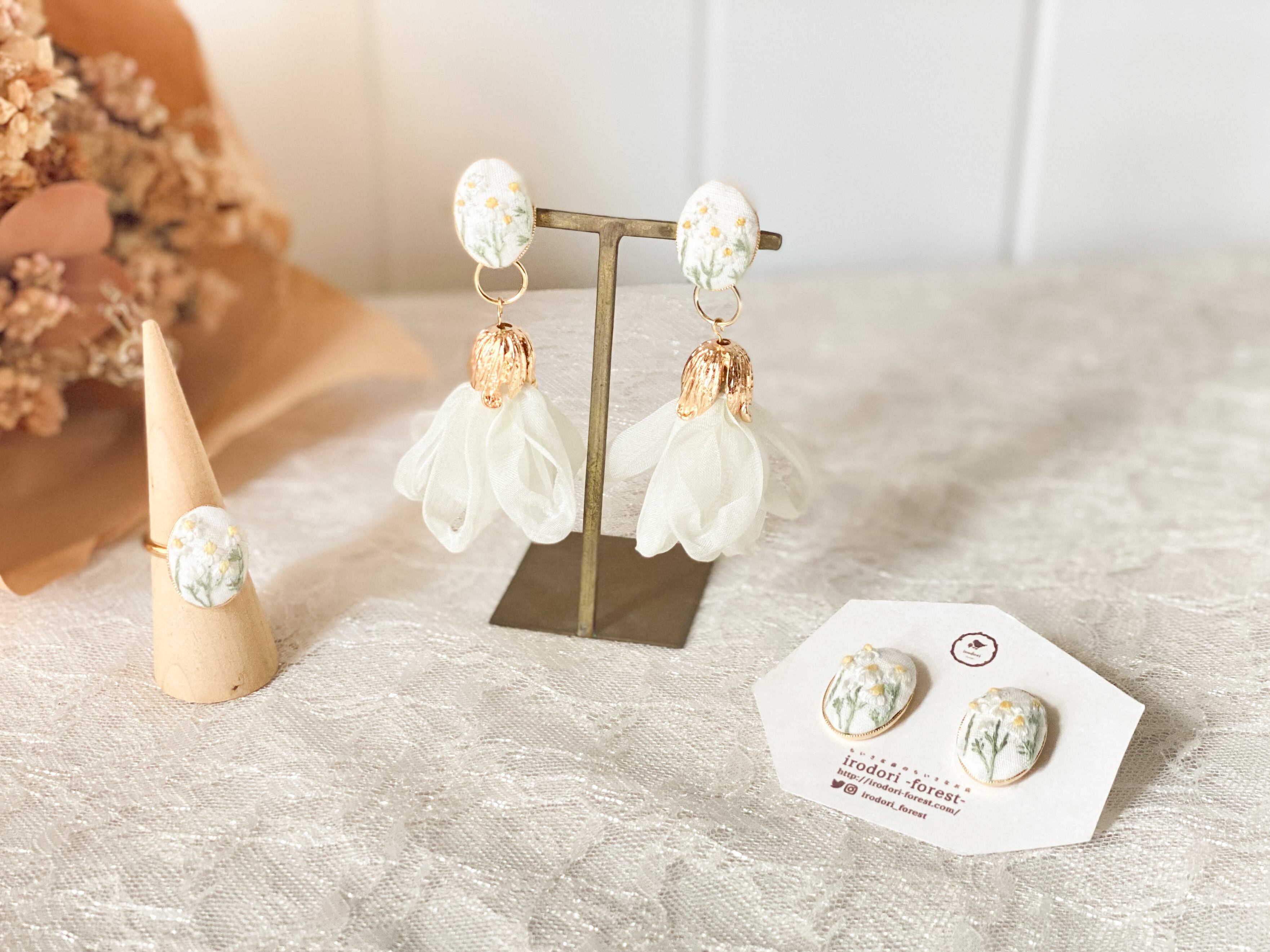 刺繍 手刺繍 イヤリング ピアス リング 指輪 カモミール ナチュラル ボタニカル 花 ご褒美 プレゼント オーダー カスタムオーダー 受注制作