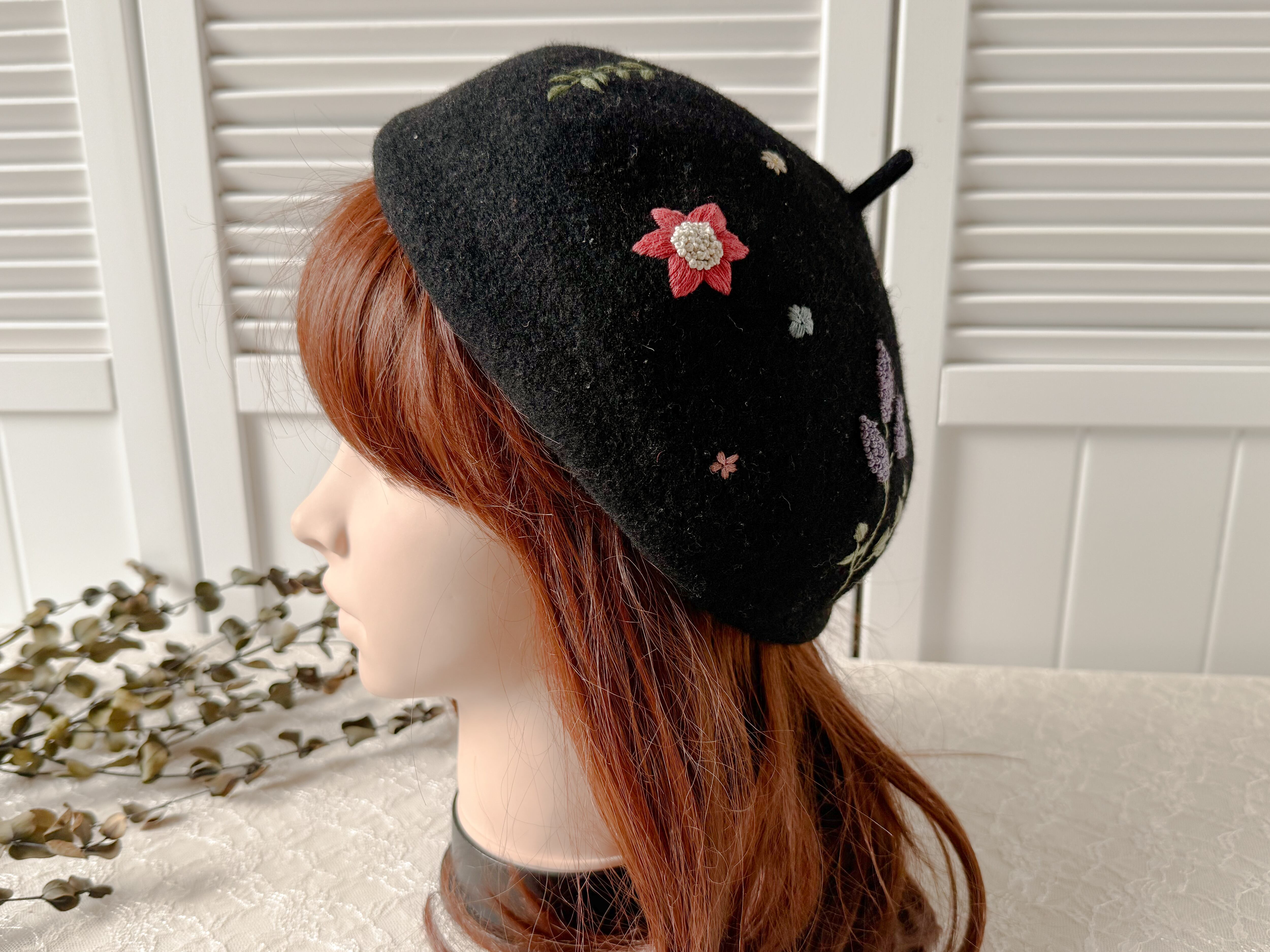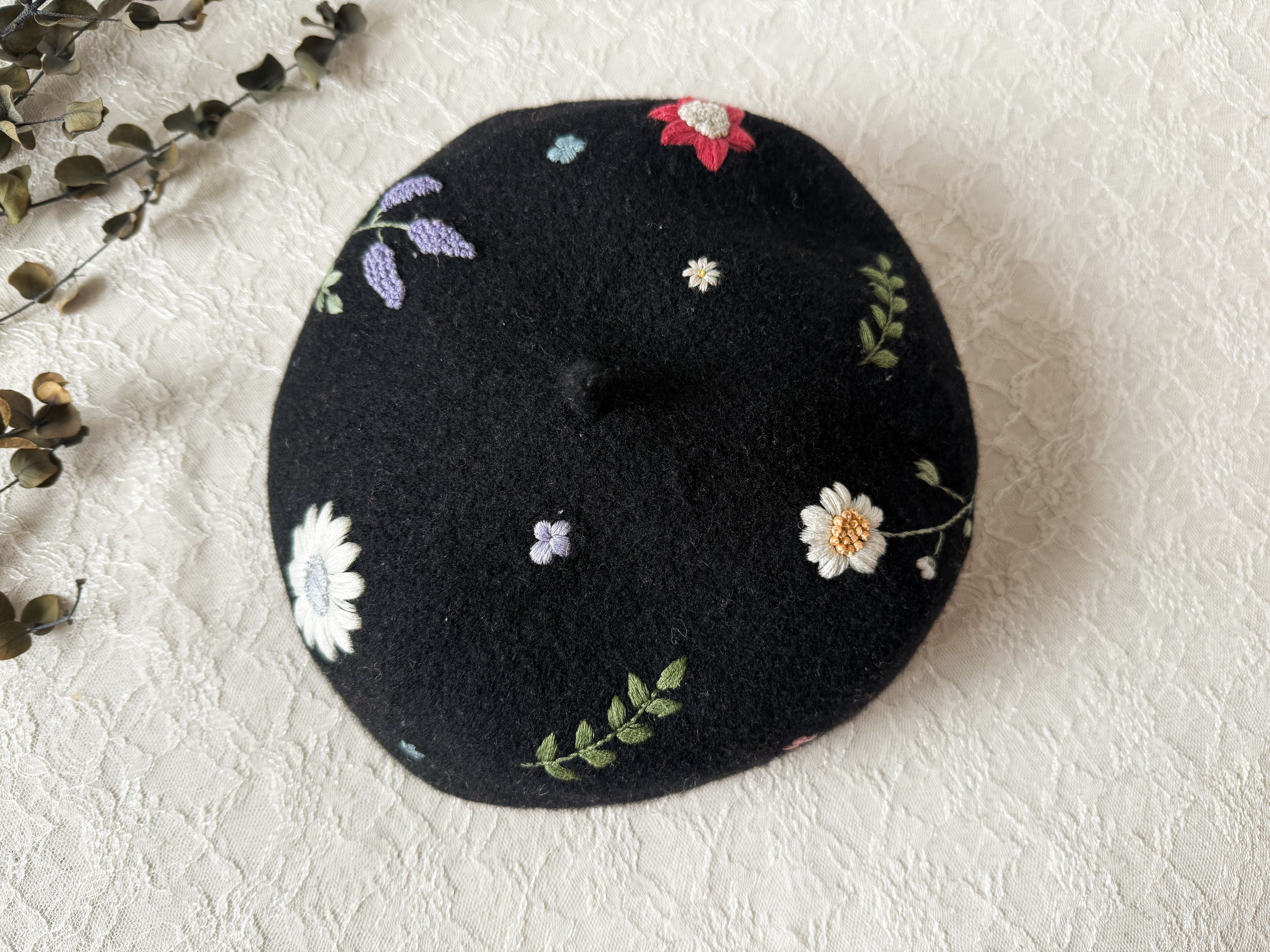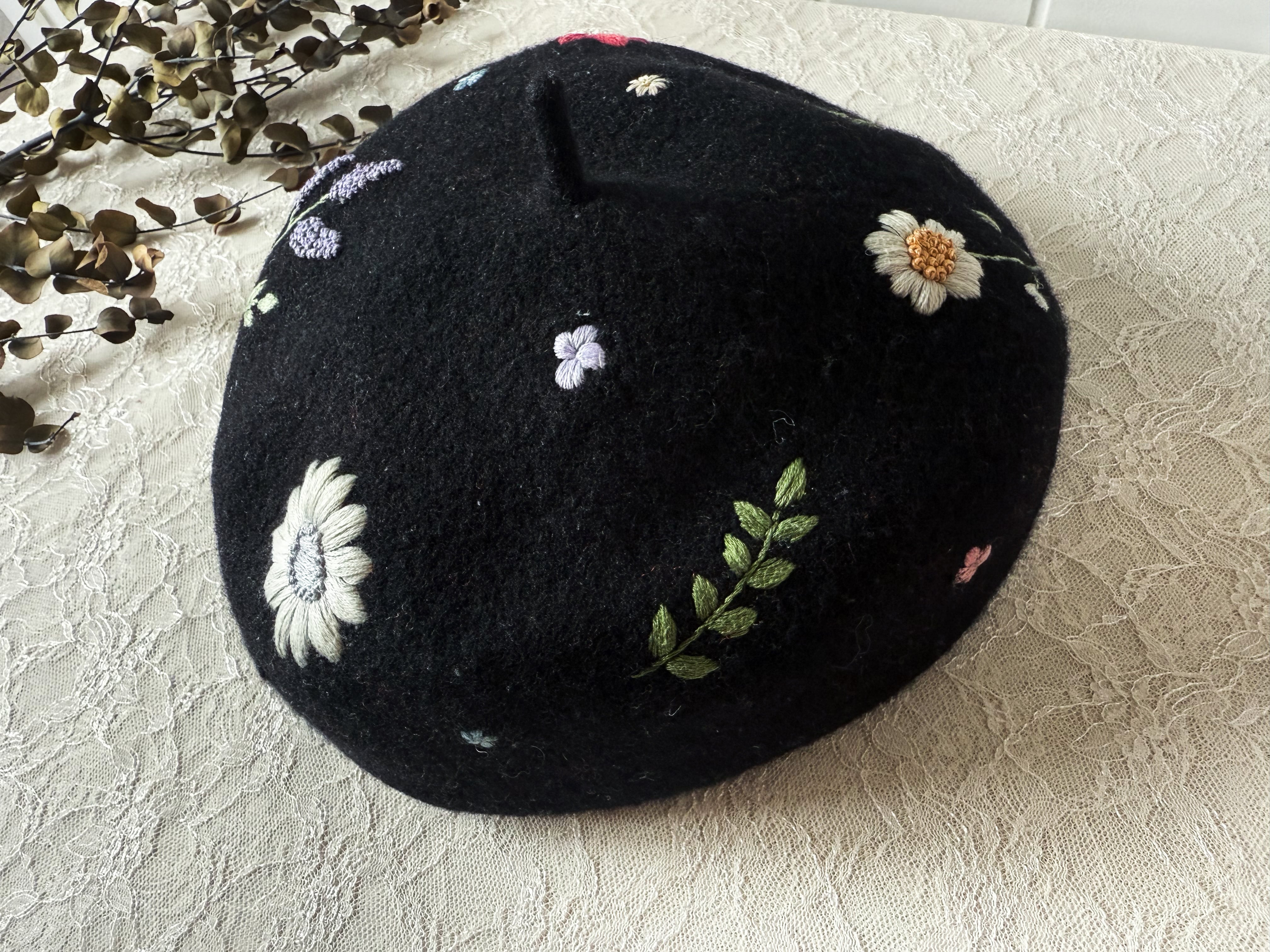 ブラックのベレーに赤や黄色、ピンクなどの大小異なる草花たちがランダムに刺繍されているため、かぶる向きで表情が変わります。