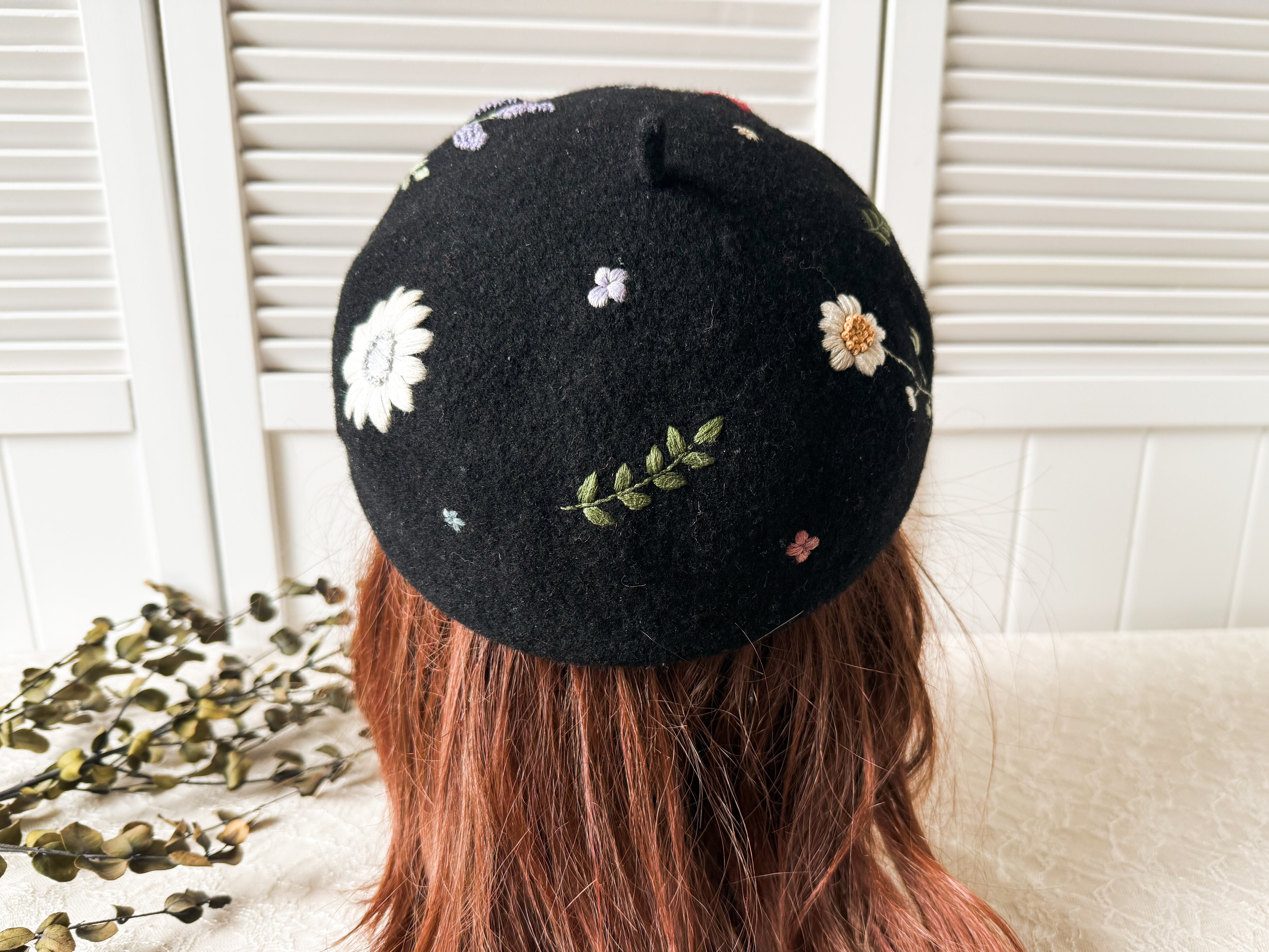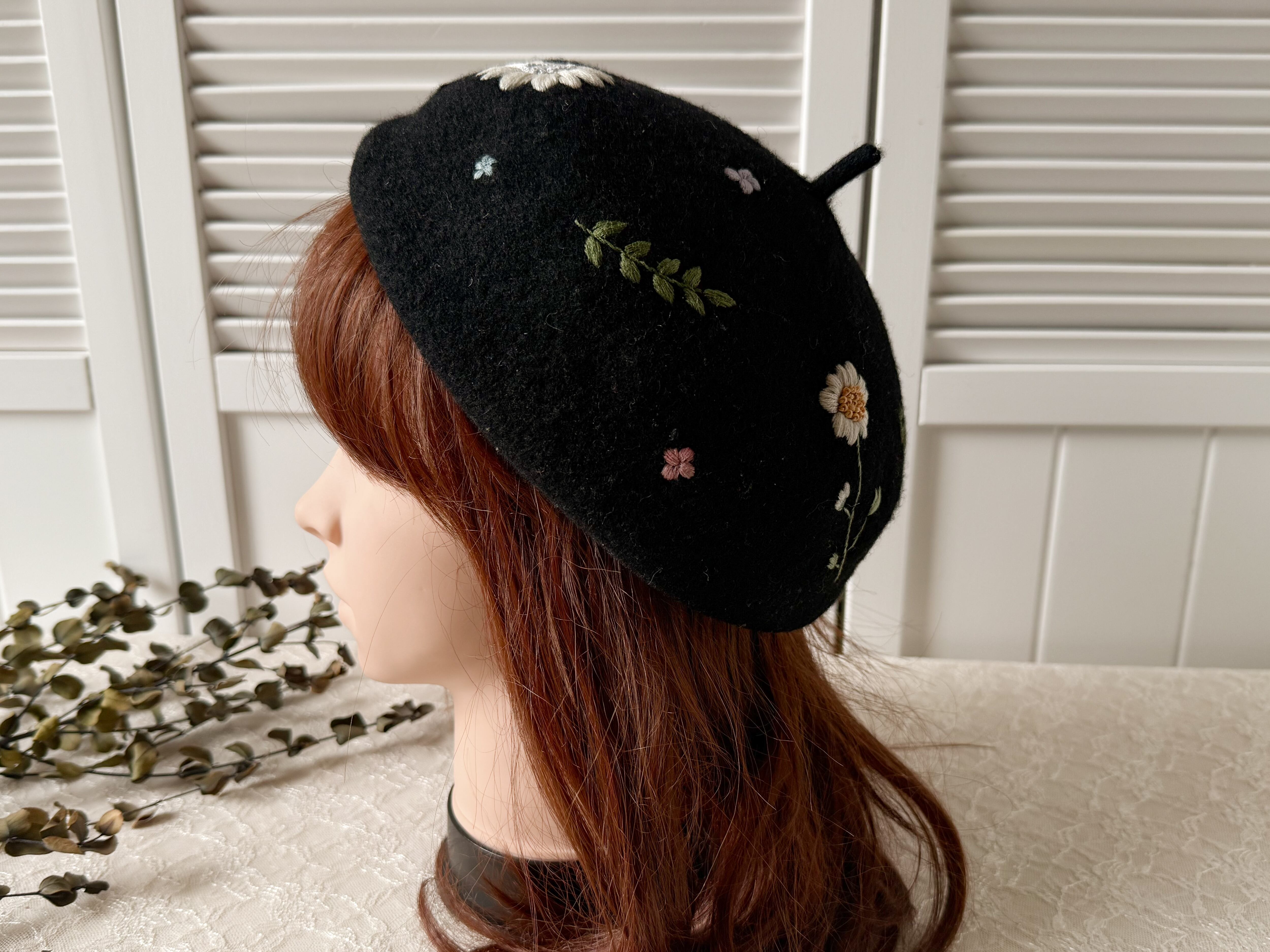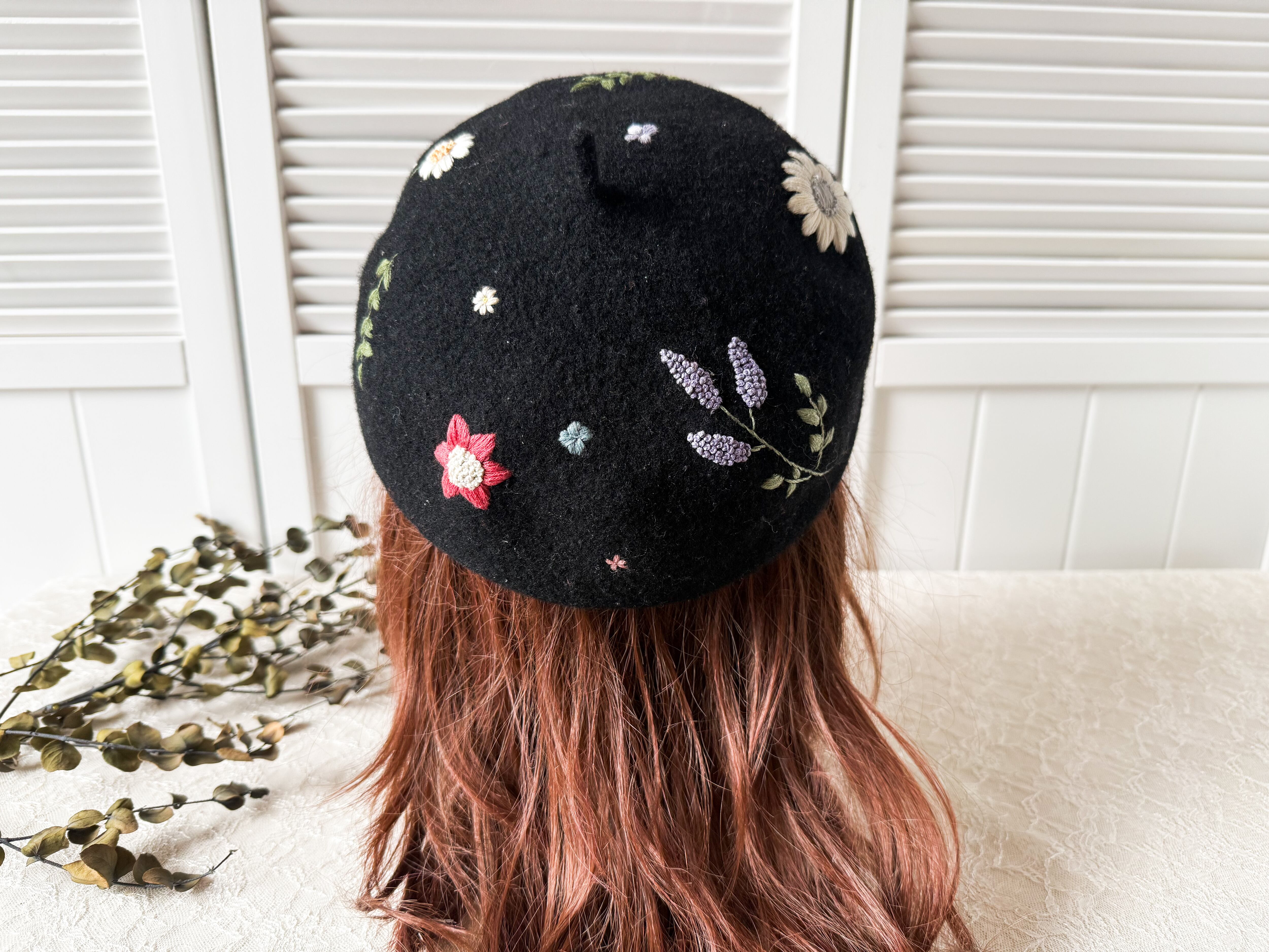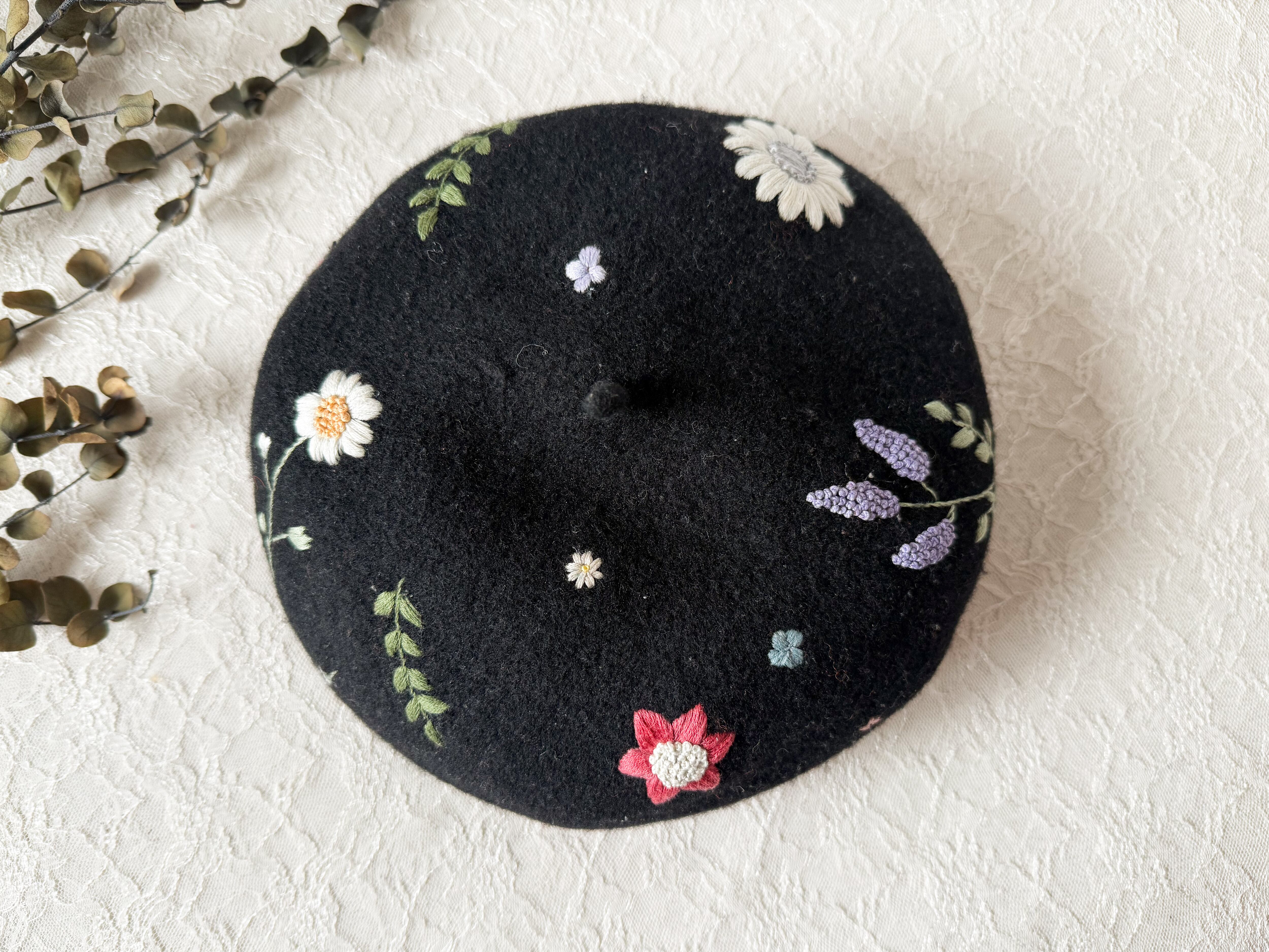 ブラックのベレーに赤や黄色、ピンクなどの大小異なる草花たちがランダムに刺繍されているため、かぶる向きで表情が変わります。